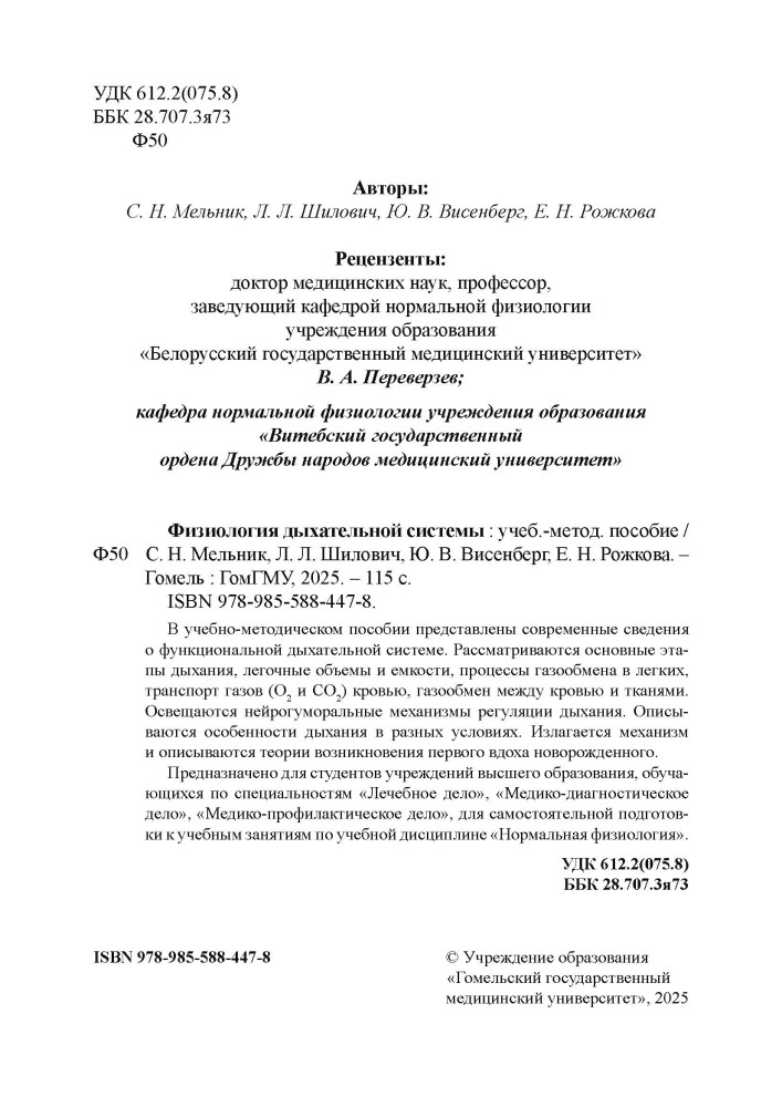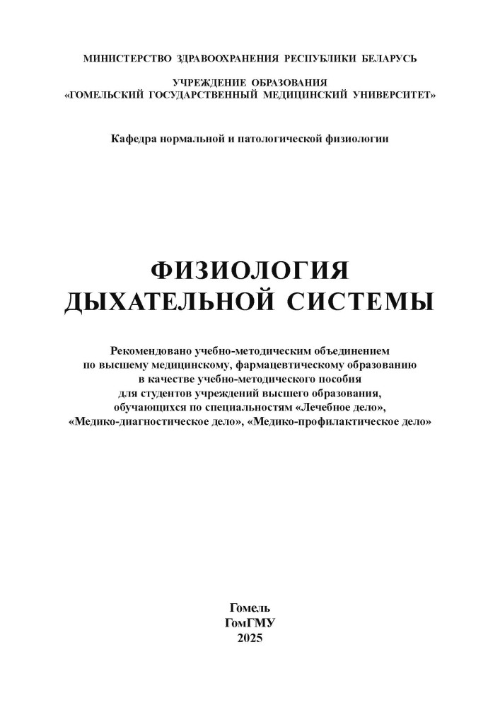 В учебно-методическом пособии представлены современные сведения о функциональной дыхательной системе. Рассматриваются основные этапы дыхания, легочные объемы и емкости, процессы газообмена в легких, транспорт газов (О2 и СО2) кровью, газообмен между кровью и тканями. Освещаются нейрогуморальные механизмы регуляции дыхания. Описываются особенности дыхания в разных условиях. Излагается механизм и описываются теории возникновения первого вдоха новорожденного.
