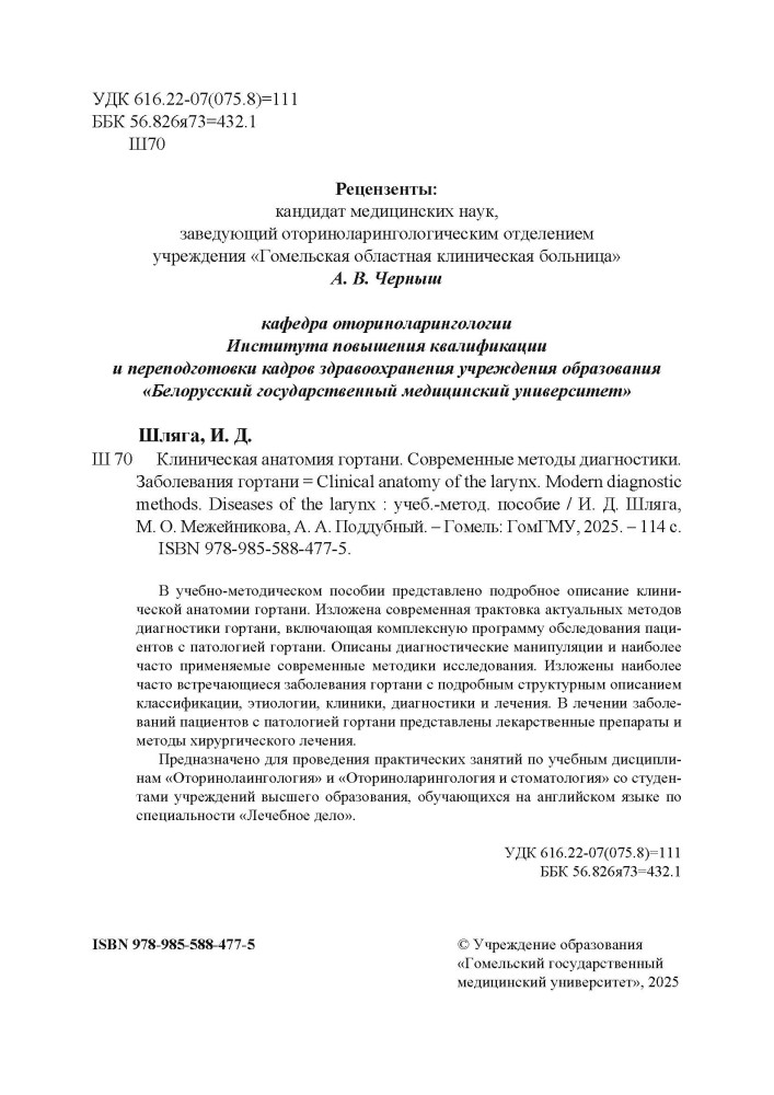 Предназначено для проведения практических занятий по учебным дисциплинам «Оторинолаингология» и «Оториноларингология и стоматология» со студентами учреждений высшего образования, обучающихся на английском языке по специальности «Лечебное дело».