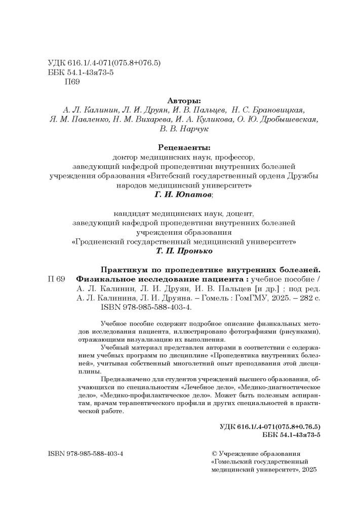 Учебное пособие содержит подробное описание физикальных методов исследования пациента, иллюстрировано фотографиями (рисунками), отражающими визуализацию их выполнения. Учебный материал представлен авторами в соответствии с содержанием учебных программ по дисциплине «Пропедевтика внутренних болезней», учитывая собственный многолетний опыт преподавания этой дисциплины.